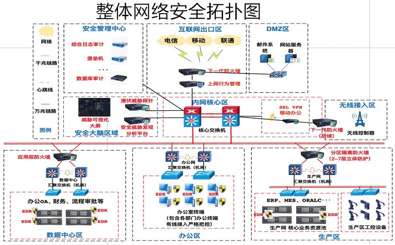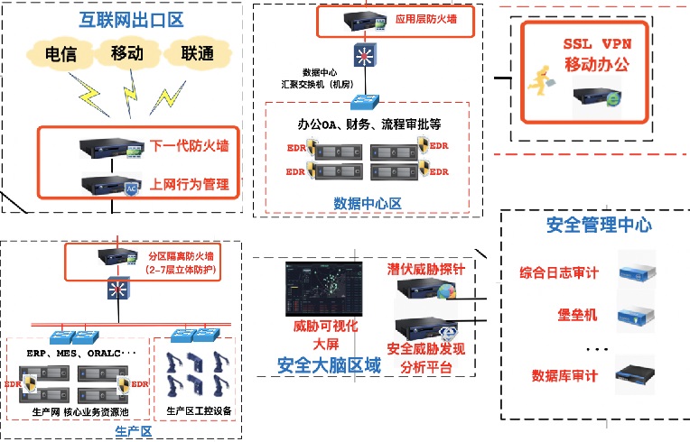 安全域劃分:集團(tuán)網(wǎng)絡(luò)劃分成辦公網(wǎng)、研發(fā)網(wǎng)、生產(chǎn)網(wǎng),數(shù)據(jù)中心網(wǎng),通過下一代防火墻實(shí)現(xiàn)網(wǎng)絡(luò)的邏輯隔離和安全防護(hù)。