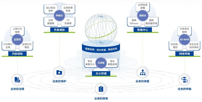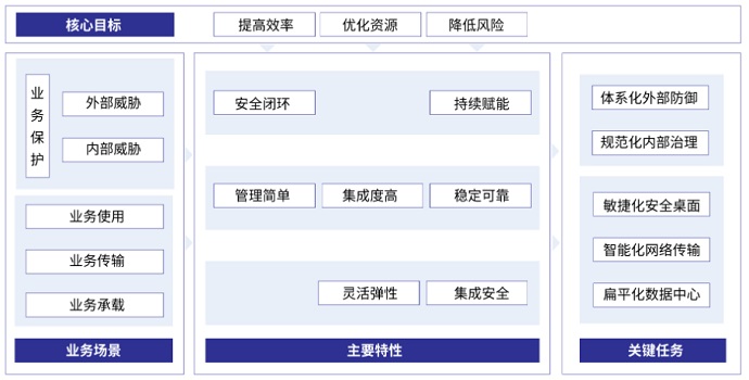數(shù)字化轉(zhuǎn)型的核心目標(biāo)是“提高效率、優(yōu)化資源、降低風(fēng)險(xiǎn)”,業(yè)務(wù)場景包含“業(yè)務(wù)保護(hù)、業(yè)務(wù)使用、業(yè)務(wù)傳輸、業(yè)務(wù)承載”,將核心目標(biāo)與業(yè)務(wù)場景相結(jié)合,可明確數(shù)字化轉(zhuǎn)型關(guān)鍵任務(wù)為“體系化外部防御、規(guī)范化內(nèi)部治理、敏捷化安全桌面、智能化網(wǎng)絡(luò)傳輸、扁平化數(shù)據(jù)中心”。企業(yè)可進(jìn)一步結(jié)合自身的發(fā)展情況,從最為緊迫的關(guān)鍵任務(wù)入手,一步步走好轉(zhuǎn)型之路。