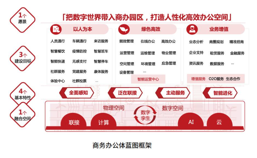 建設(shè)目標(biāo),則可以結(jié)合商辦特點(diǎn),把如何以人為本、綠色高效、業(yè)務(wù)增值在商辦園區(qū)展開設(shè)計(jì);同樣,全面感知、泛在聯(lián)接、主動(dòng)服務(wù)和智能進(jìn)化 4個(gè)基本特征,1個(gè)融合空間等內(nèi)容,作為支撐的基礎(chǔ),可結(jié)合商辦園區(qū)的特點(diǎn),在技術(shù)實(shí)現(xiàn)層面加以詳細(xì)規(guī)劃。