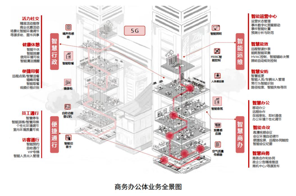 商務(wù)辦公體承載了人們辦公、交流與社交等功能。商務(wù)辦公智慧化發(fā)展的核心,是以用戶體驗(yàn)為中心,運(yùn)用數(shù)字化技術(shù)打造智慧化和以人為本的商務(wù)辦公環(huán)境,提高員工工作效率,降低能源損耗,保障辦公安全,由內(nèi)至外提升企業(yè)形象。用數(shù)字化技術(shù)賦能辦公,實(shí)現(xiàn)人們"智慧工作"的追求,具有時(shí)代意義。下面介紹商務(wù)辦公體藍(lán)圖框架及全景圖∶