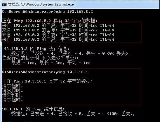 比如:ping 192.168.0.2就是通的,而ping不在同一個(gè)網(wǎng)段的10.3.16.1就不同,如下圖: